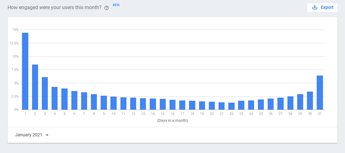 يوضّح الرسم البياني لتفاعل المستخدمين كيفية تفاعل المستخدمين مع الإجراء الخاص بك خلال شهر محدّد. يُعرف هذا الرسم البياني عادةً باسم منحنى المستخدم الفعّال، ويتيح لك الاطّلاع على عدد المستخدمين الذين يمثلون "مستخدمين متمرّسين"، ما يعني المستخدمين المتخصصين الذين يتفاعلون مع الإجراء الخاص بك بانتظام، من خلال تخطيط النسبة المئوية للمستخدمين الذين يتفاعلون مع الإجراء الخاص بك حسب الأيام من الشهر.