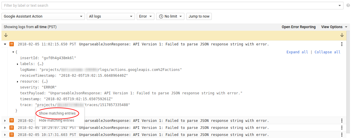 Se il progetto di Actions non riesce o sembra funzionare male, la causa del problema potrebbe non essere chiara. Dalla console Actions, puoi visualizzare log dettagliati per il tuo progetto, che possono fornirti informazioni più dettagliate su ciò che sta succedendo.