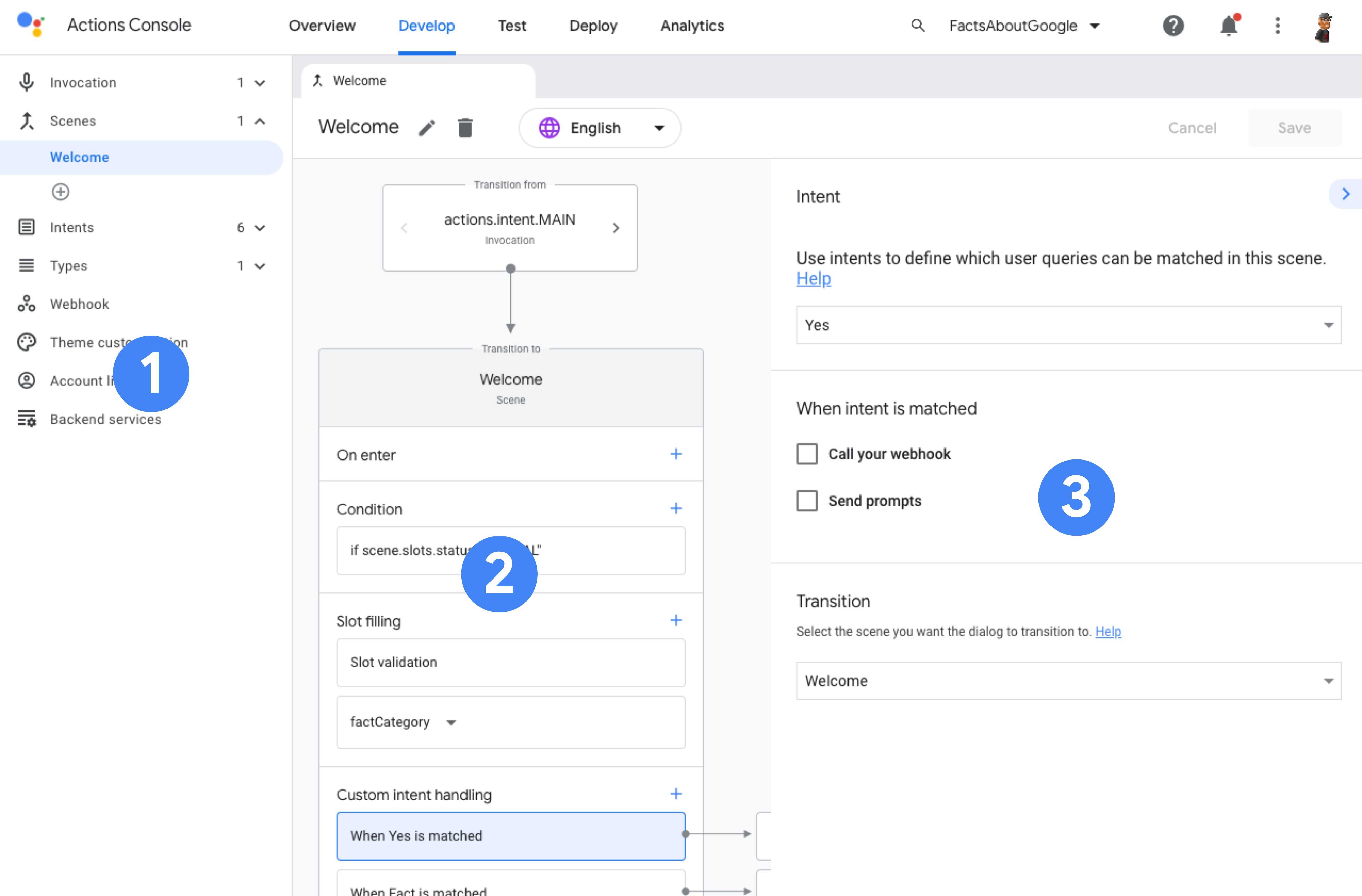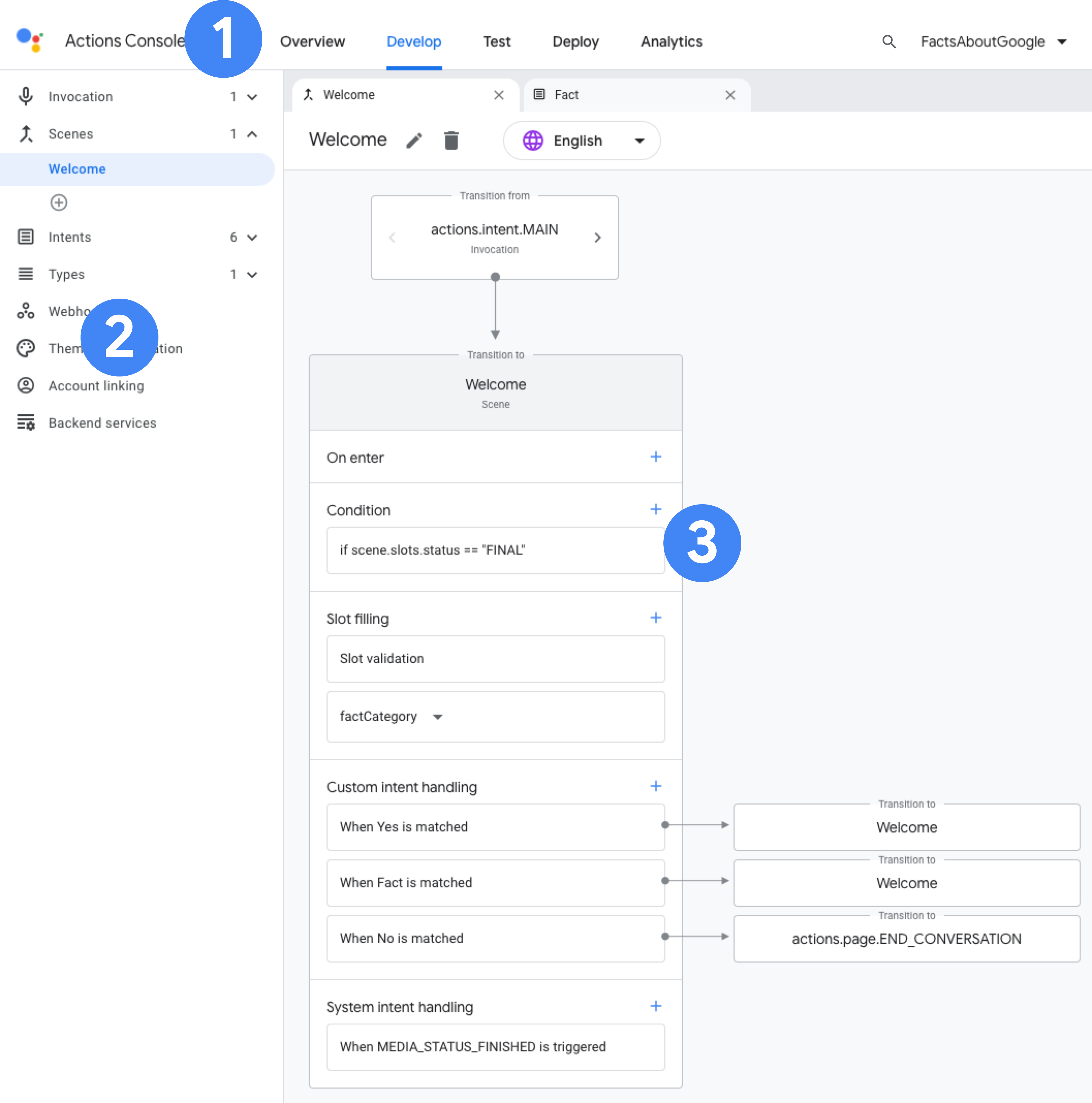 控制台的「開發」部分提供視覺化網頁式 IDE,也就是以 Actions SDK 為基礎建構的 Actions Builder。