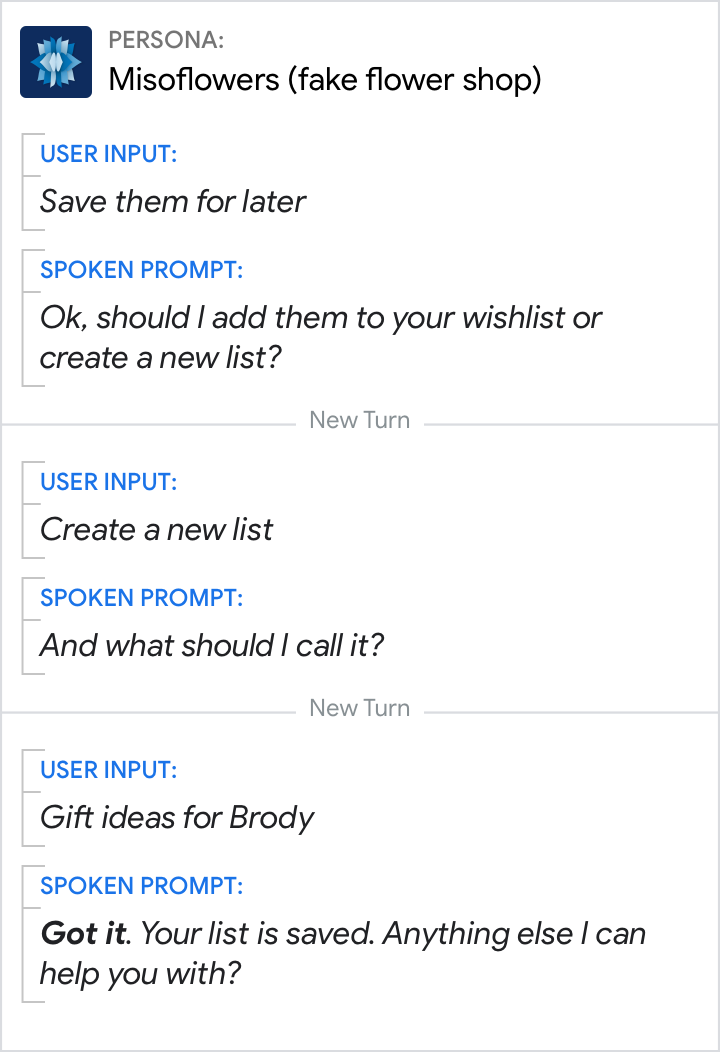 Những từ như “Tuyệt vời” hoặc “Đã hiểu” thừa nhận rằng cá tính của bạn đã nghe thấy và lưu tiêu đề danh sách.