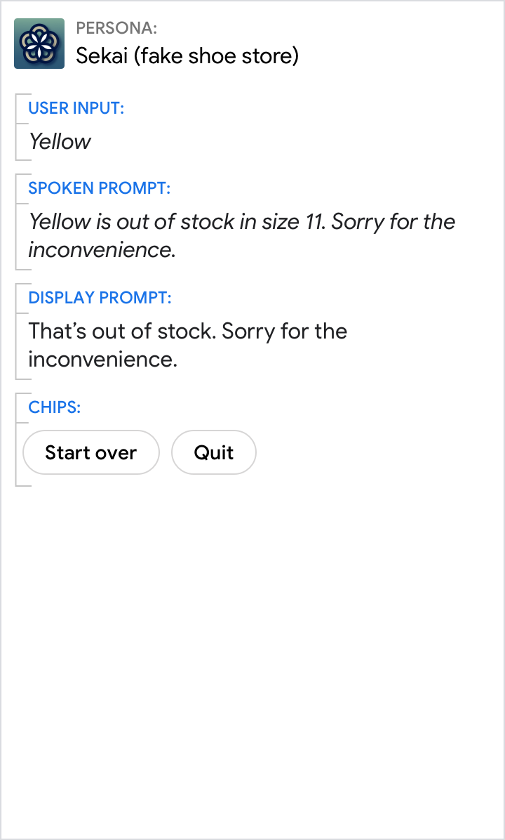 La opción "Lo siento" es muy útil cuando no hay coincidencia en los mensajes para dejarle en claro al usuario que su persona no pudo entender o interpretar su respuesta en contexto. Pero evita el uso excesivo. En el caso de los errores del sistema, evita decir "perdón" cuando no sea tu culpa.
