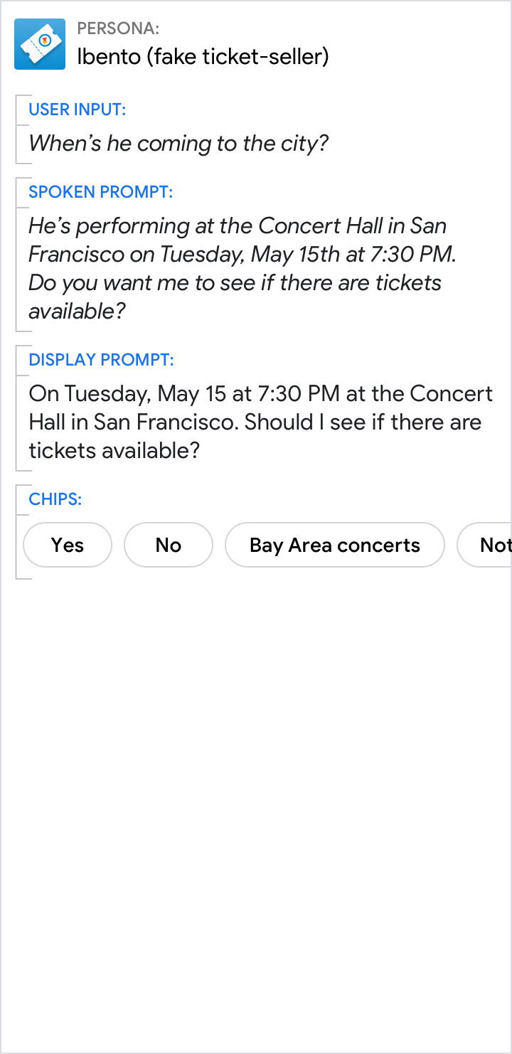 Użyj komunikatów głosowych i wyświetlanych, aby udzielić odpowiedzi na zadane pytanie użytkownika (w tym przykładzie o 11:30). Aby uzyskać powiązane szczegóły, użyj treści wizualnych.