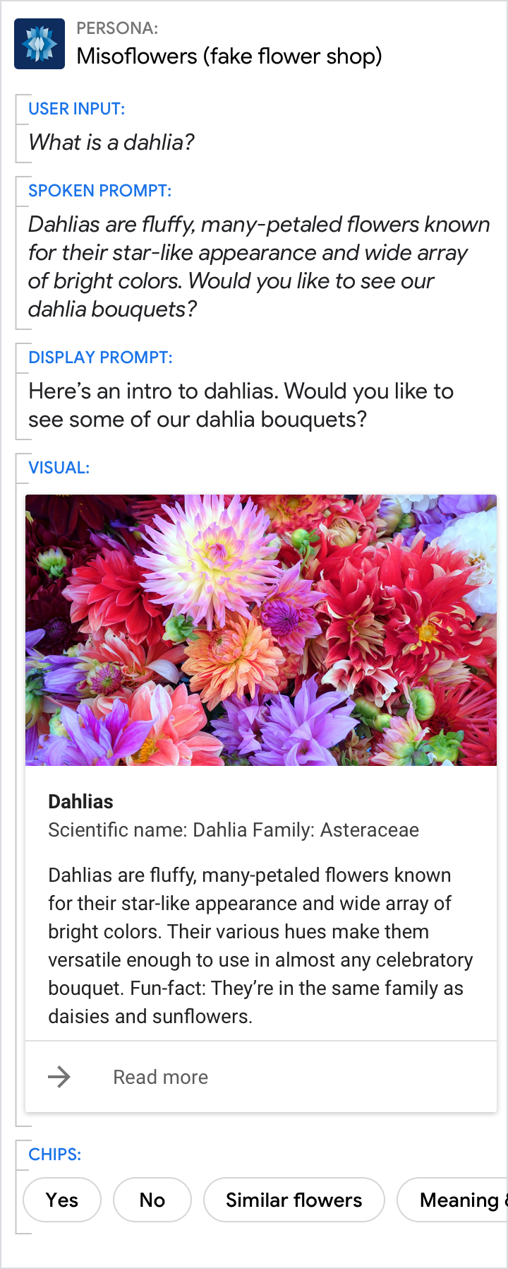 ใช้ข้อความแจ้งและคําพูดเพื่อให้คําตอบที่เจาะจงสําหรับคําถามที่กําหนดเส้นทางของผู้ใช้ (ในตัวอย่างนี้คือ 11.30 น.) ใช้ภาพเพื่อดูรายละเอียดที่เกี่ยวข้อง