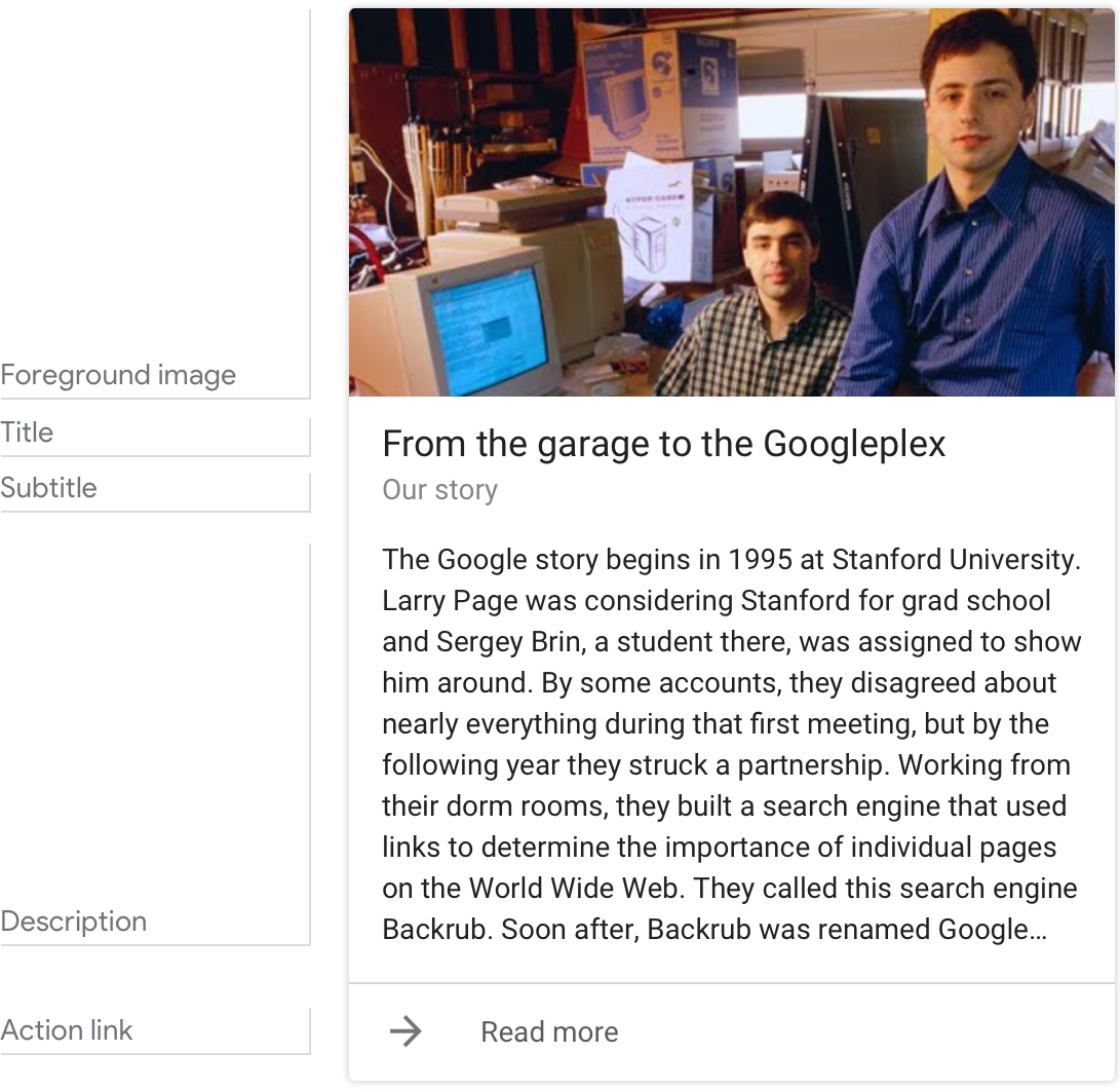 การ์ดพื้นฐานใช้เพื่ออธิบายเอนทิตี (เช่น หัวข้อซึ่งรวมถึงผู้คน สถานที่ หรือสิ่งต่างๆ) การ์ดเหล่านี้จะใช้ได้ดีที่สุดเมื่อจําเป็นต้องใช้รูปแบบคําตอบ "รูปแบบคําจํากัดความ" ใช้ข้อมูลดังกล่าวเพื่อสรุปข้อมูลหรือให้ข้อมูลเพิ่มเติมที่เกี่ยวข้องแก่ผู้ใช้
