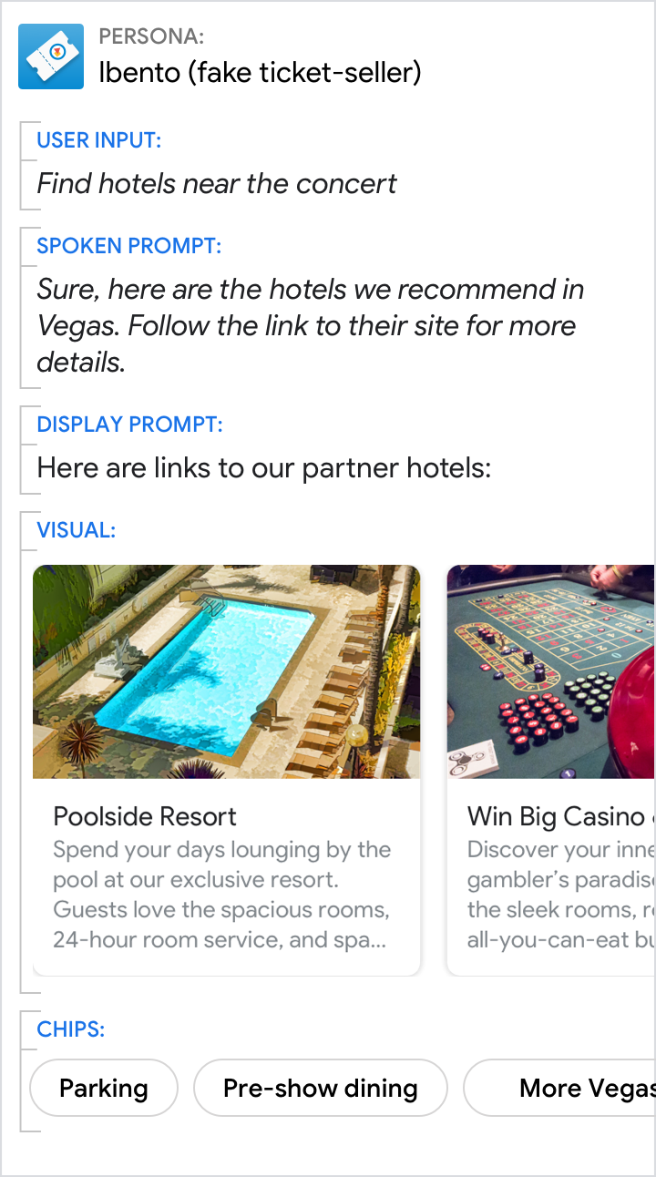 Просмотр каруселей выводит пользователей из мультимодального разговорного взаимодействия с вашим действием, поэтому сделайте этот переход понятным для пользователей. Они больше не будут разговаривать/печатать с вашим действием, а вместо этого будут нажимать/читать контент из веб-браузера.