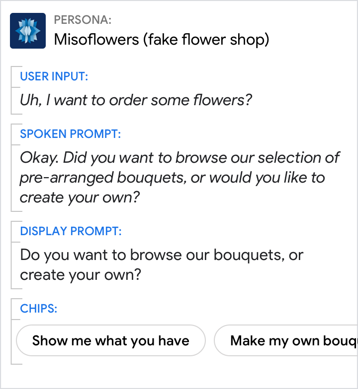 Chips help users 1) refine topics, 2) discover related topics, next steps, and pivots, and 3) take action. Sometimes it’s faster and easier for users to tap a chip than it is to say or type their response. When users tap a chip, that text becomes part of the conversation as the user’s response.