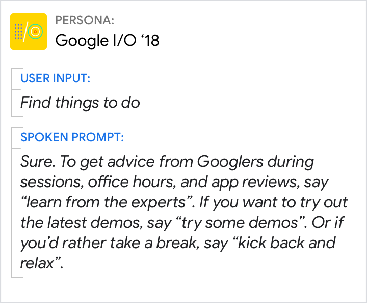 Konuşma arayüzlerinin büyüsü, kullanıcıların bunları nasıl kullanacaklarını öğrenmek zorunda olmamasıdır. Karakteriniz, kullanıcıyı bir komut ezberlemeye zorlamak yerine, kullanıcının kelime tercihlerine uyum sağlamak için doğal dil anlama gücünden yararlanmalıdır. Kullanıcıların dar odaklı bir soruya (ör. Neler öğretileceğinden (ör. "Diğer seçenekleri duymak için "devam et" diyebilirsin.)