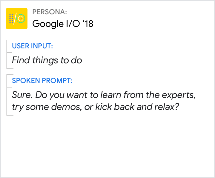 대화 인터페이스의 장점은 사용자가 사용 방법을 배울 필요가 없다는 것입니다. 캐릭터는 사용자가 일련의 명령어를 외워야 하는 대신 자연어 이해 기능을 활용하여 사용자의 단어 선택에 맞게 조정해야 합니다. 사용자가 범위가 좁음 (예: '더 많은 옵션을 듣고 싶으신가요?')는 어떤 말을 해야 할지 가르치는 것 (예: "옵션을 더 들으려면 '계속'이라고 말씀하세요.')