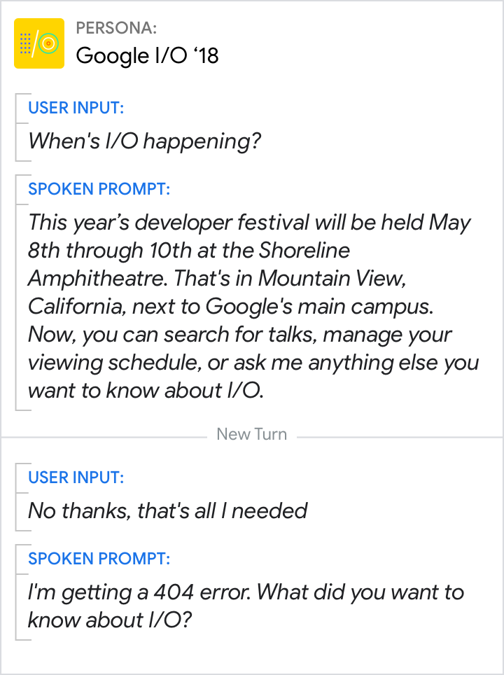 Nawet jeśli są zdecydowane intencje, wciąż może się zdarzyć błąd. Użytkownicy mogą wyłączyć skrypt, pozostając w stanie cichym (braku wejścia) lub mówiąc nieoczekiwanego błędu (braku dopasowania). Używaj komunikatów o błędach, które delikatnie nakłaniają użytkowników do powrotu na ścieżkę lub zmiany oczekiwań.