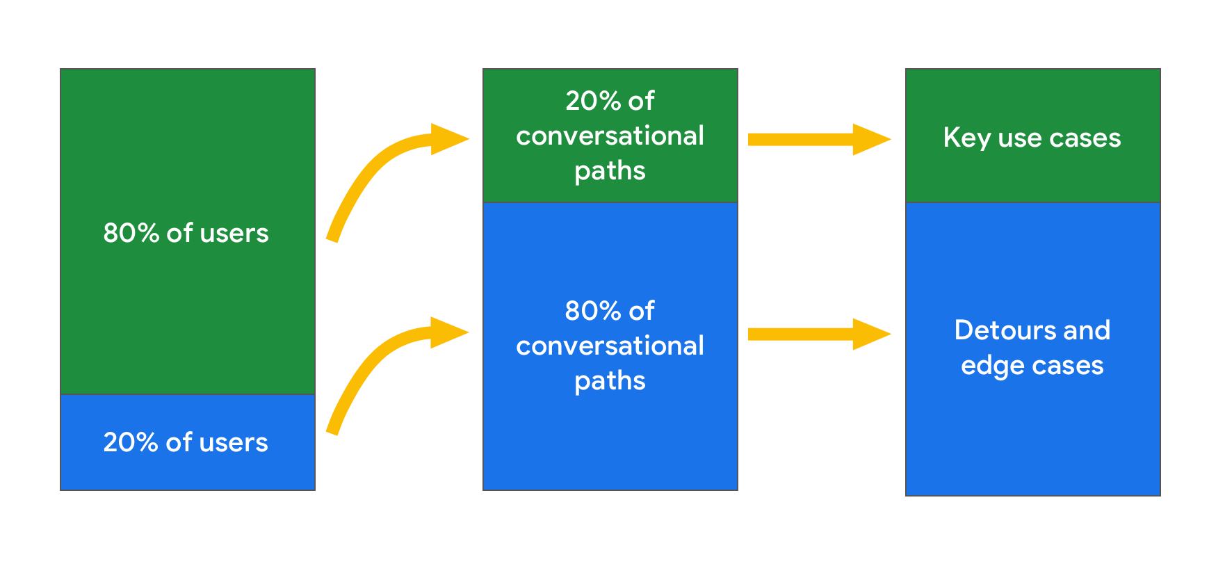W przypadku projektowania rozmów ta reguła mówi, że nie wszystkie ścieżki są sobie równe. 80% użytkowników podąża za 20% najczęstszymi ścieżkami w oknie dialogowym. Dlatego inwestuj odpowiednie zasoby, aby osiągnąć jak najlepsze wyniki.