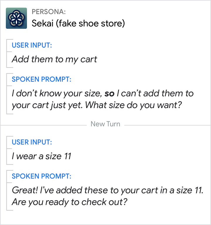 बातचीत के मार्कर को आसानी से पहचानने के लिए, इन शर्तों का इस्तेमाल करें. आम तौर पर, इन्हें स्वीकार किए जाने की जानकारी और/या सीधे तौर पर दी गई पुष्टि की वजह से उलझन होती है. हालांकि, डायलॉग में हर कॉम्पोनेंट का मकसद अलग होता है. इसलिए, कभी-कभी उन्हें एक ही प्रॉम्प्ट में शामिल कर लिया जाता है.