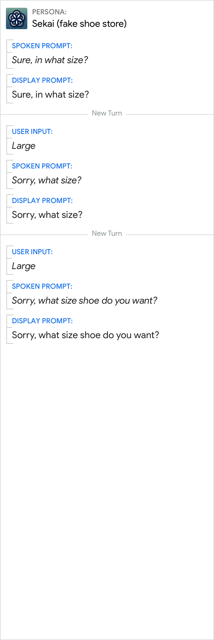 Errors occur when your Action can’t move forward because it 1) didn’t understand the user’s input, or 2) didn’t get input. Since this can happen at any time, your Action needs to have unique error handling for each turn in the conversation to help the user get back on track.