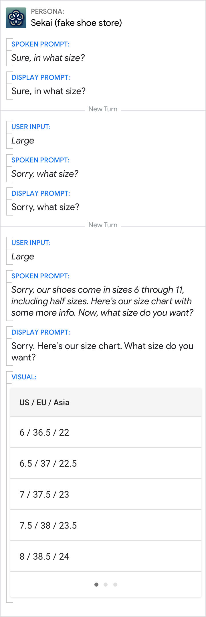 Dobra obsługa błędów zależy od kontekstu. Nawet jeśli prosisz o te same informacje, w 2 lub 3 próbie kontekst rozmowy jest inny. Aby wyświetlić w odpowiednim kontekście odpowiedni komunikat o błędzie, musisz monitorować liczbę i rodzaj błędów.