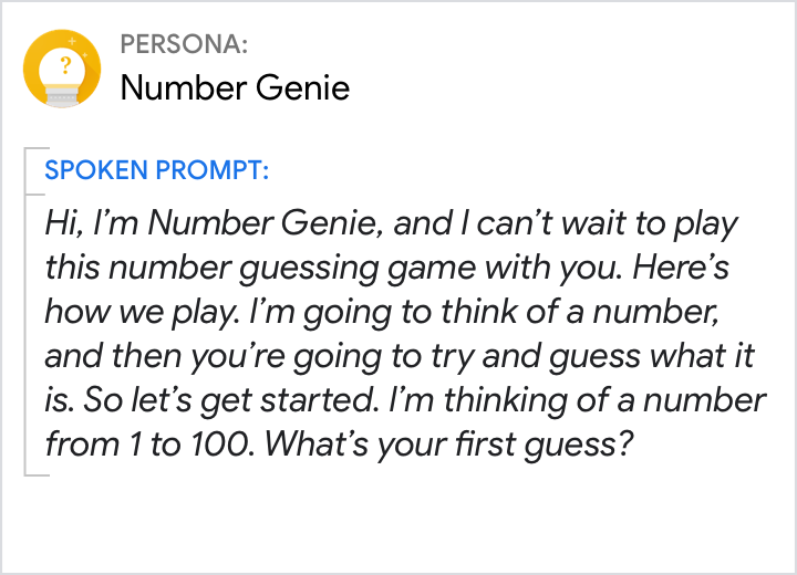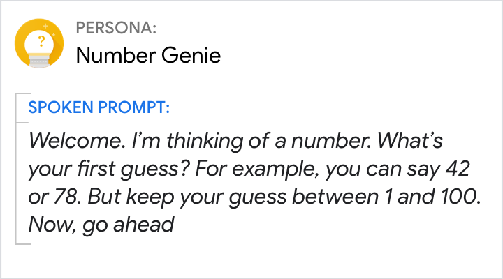 Lascia che sia l'utente ad avere il controllo. Fai domande per comunicare all'utente che è il suo turno. Gli utenti dovrebbero trovare facile rispondere a questa domanda incentrata sull'immaginazione dicendo "un numero da 1 a 100".
