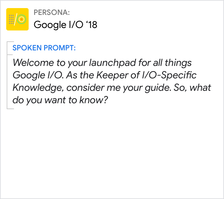 Nazwa „Google I/O 18” nie do końca wie, do czego służy ta akcja, dlatego musisz podać swój profil mentalny. Akcja jest opisana jako „panel do uruchamiania”, a „Strażnik wiedzy o konferencji I/O” – ma wywołać funkcję mistrza gry i przewodnika.