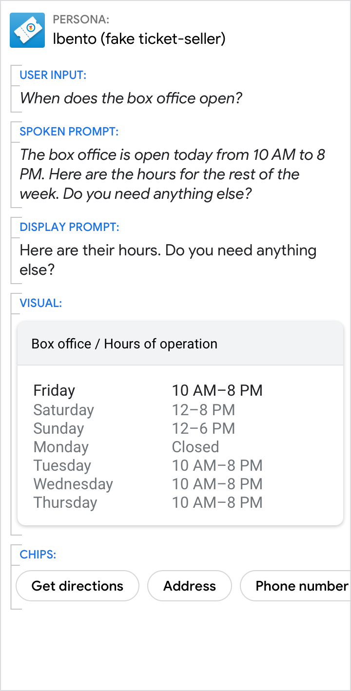 ใช้ข้อความแจ้งและคําพูดเพื่อให้คําตอบที่เจาะจงสําหรับคําถามที่กําหนดเส้นทางของผู้ใช้ (ในตัวอย่างนี้คือ 11.30 น.) ใช้ภาพเพื่อดูรายละเอียดที่เกี่ยวข้อง