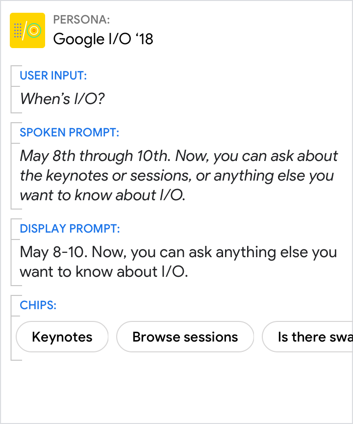 암시적인 확인("...올해의 개발자 축제 ...")을 사용하여 맥락을 유지하여 대화의 진전을 이룰 수 있습니다. 음성 메시지는 최종 포커스를 사용하는 반면, 디스플레이는 검색 가능성을 위해 프런트로드 키 정보를 표시합니다.