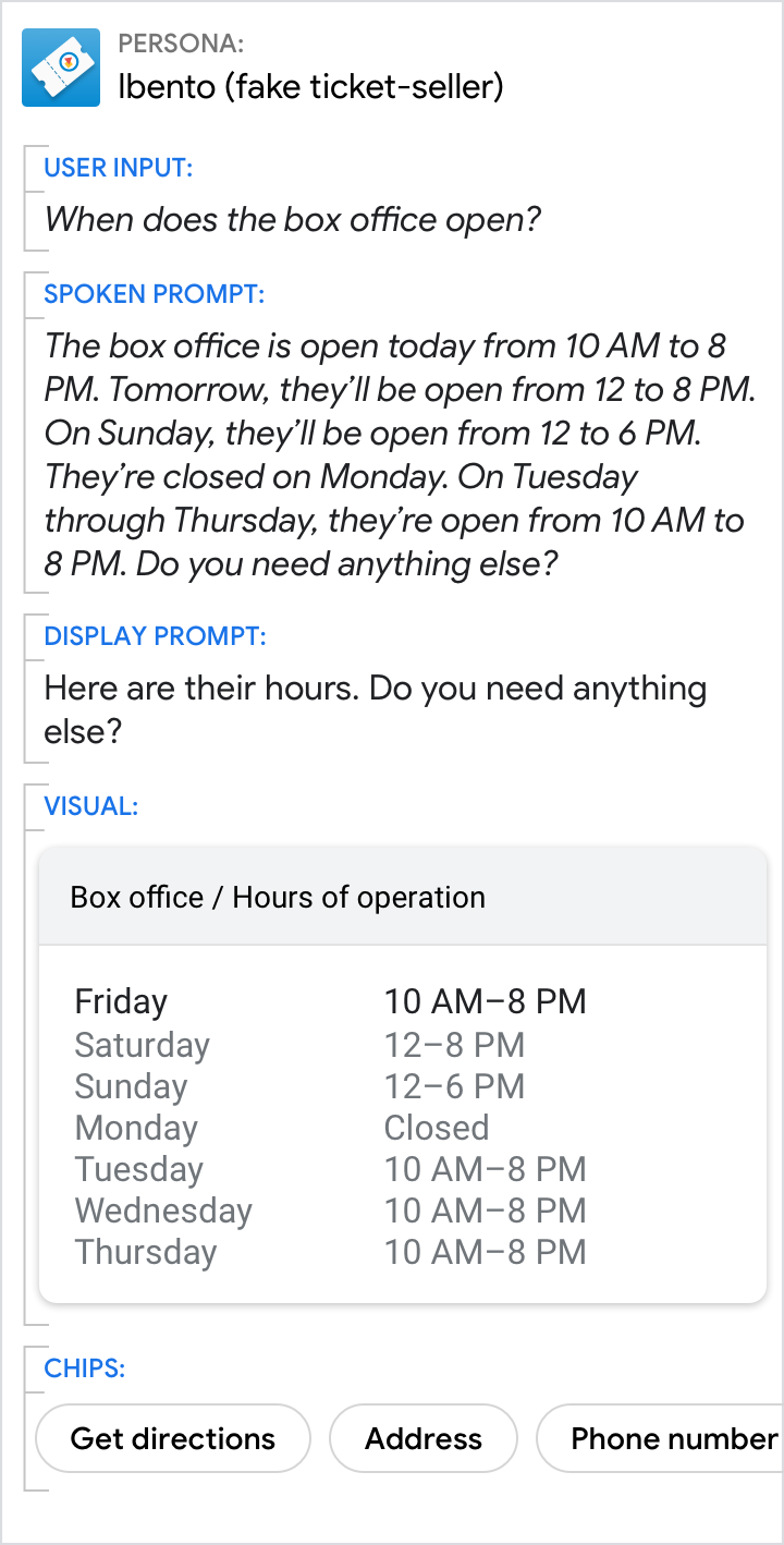 Utilisez des confirmations implicites ("le festival des développeurs de cette année...") pour faire avancer la conversation en maintenant le contexte. Notez que les invites vocales utilisent la mise au point finale, tandis que l'écran invite à lire les informations essentielles pour la numérisation.