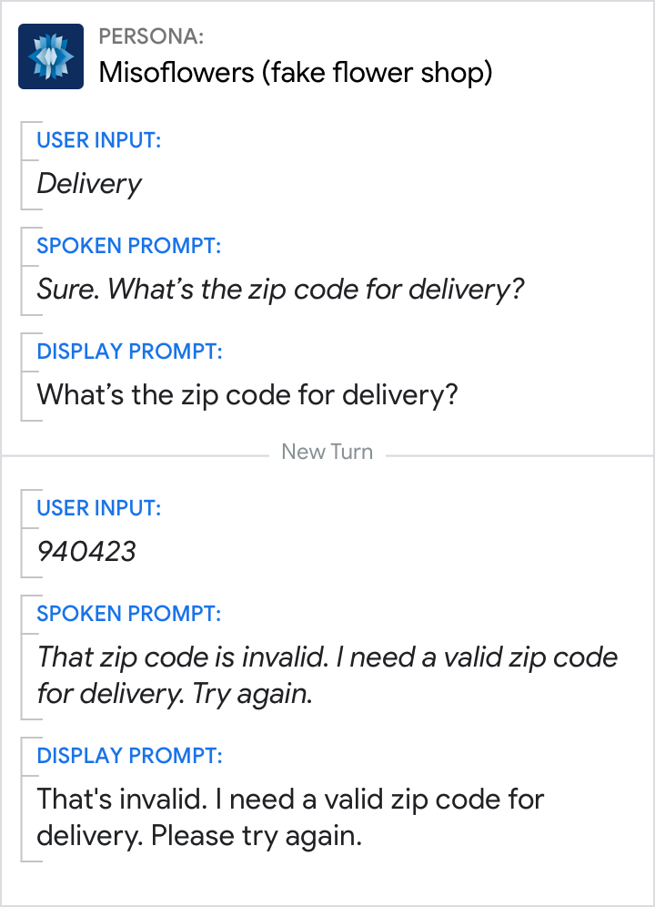 وتوقّعت الشخصية هنا الإجابة عن السؤال المتعلق بنوع الأحذية فقط. سيشعر المستخدمون التعاونيون بالإحباط نتيجة تكرار حجم الحذاء مرة أخرى.