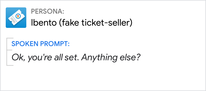 อย่าลืมเพิ่มการจัดการสําหรับวลี เช่น "เรียบร้อยแล้ว" "ทั้งหมด" หรือ "ขอบคุณ" โดยความหมายโดยนัยมักจะเป็น "ฉันมีทุกอย่างที่ต้องการจากการสนทนานี้ และการพูดคุยเสร็จสิ้นแล้ว สวัสดีครับ"