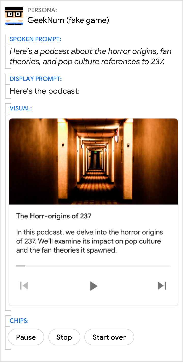 A resposta de mídia é usada para dar visibilidade a uma faixa de áudio. Por exemplo, nome, duração, imagem opcional associada e controle de reprodução/pausa da faixa. Este cartão é usado para apresentar ao usuário uma única parte de áudio.