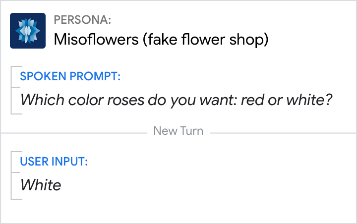 हालांकि, उपयोगकर्ता से कोई सवाल पूछने से न डरें—इसका मतलब यह नहीं है कि आपको हर ऐसे जवाब का समर्थन करना चाहिए जिसकी कल्पना की जा सकती है. सवाल के जवाब देने का तरीका इस बात पर निर्भर करता है कि उपयोगकर्ता क्या कह सकता है. इस वाक्यांश में, ओपन-एंडेड या वाइड-फ़ोकस वाले सवालों से लेकर क्लोज़-एंडेड या नैरो-फ़ोकस वाले सवालों तक शामिल हो सकते हैं.बातचीत का डिज़ाइन अच्छा होता है. उपयोगकर्ताओं को लगता है कि वे कंट्रोल में हैं, जबकि वे कुछ भी बोल सकते हैं. हालांकि, यह डायलॉग उन्हें स्क्रिप्ट से पहले की शुरुआत वाले पाथ पर ले जाता है.