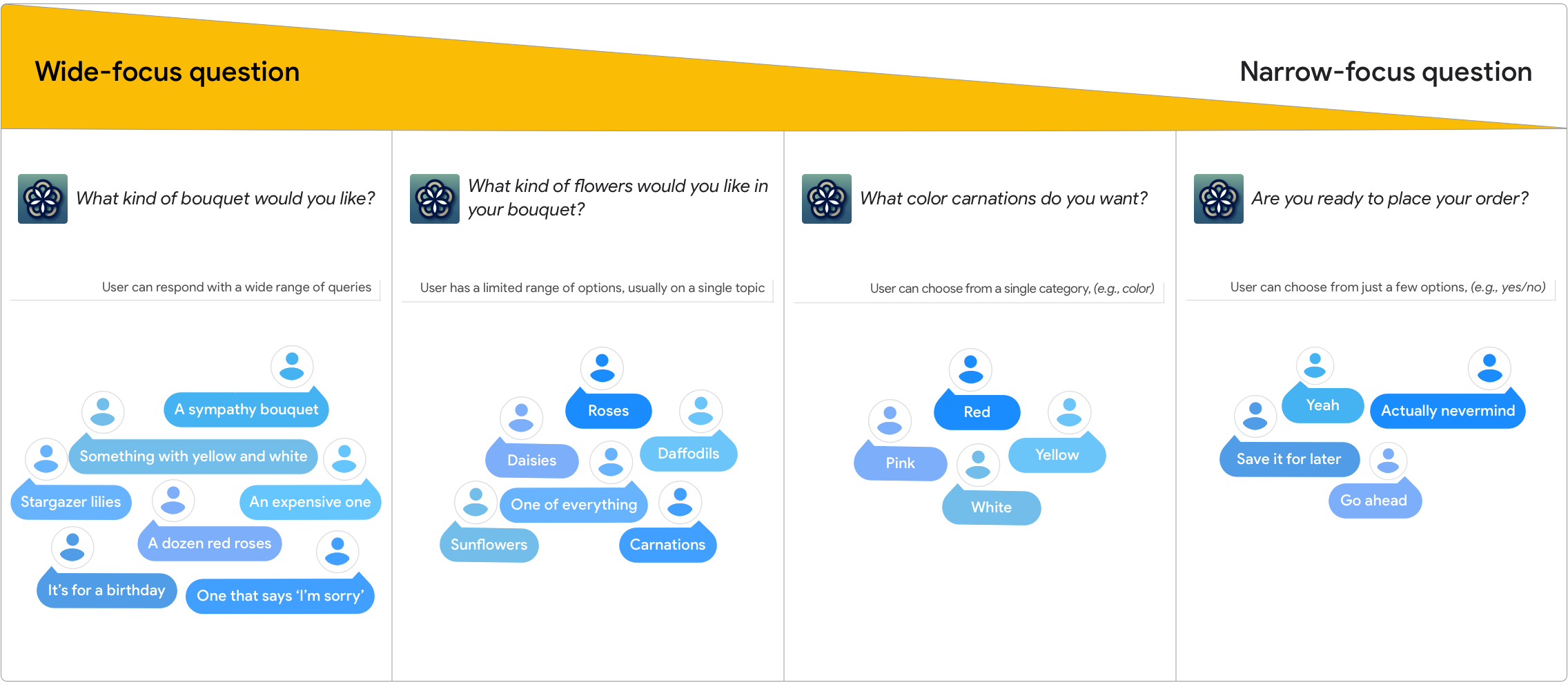हालांकि, उपयोगकर्ता से कोई सवाल पूछने से न डरें—इसका मतलब यह नहीं है कि आपको हर ऐसे जवाब का समर्थन करना चाहिए जिसकी कल्पना की जा सकती है. सवाल के जवाब देने का तरीका इस बात पर निर्भर करता है कि उपयोगकर्ता क्या कह सकता है. इस वाक्यांश में, ओपन-एंडेड या वाइड-फ़ोकस वाले सवालों से लेकर क्लोज़-एंडेड या नैरो-फ़ोकस वाले सवालों तक शामिल हो सकते हैं.बातचीत का डिज़ाइन अच्छा होता है. उपयोगकर्ताओं को लगता है कि वे कंट्रोल में हैं, जबकि वे कुछ भी बोल सकते हैं. हालांकि, यह डायलॉग उन्हें स्क्रिप्ट से पहले की शुरुआत वाले पाथ पर ले जाता है.