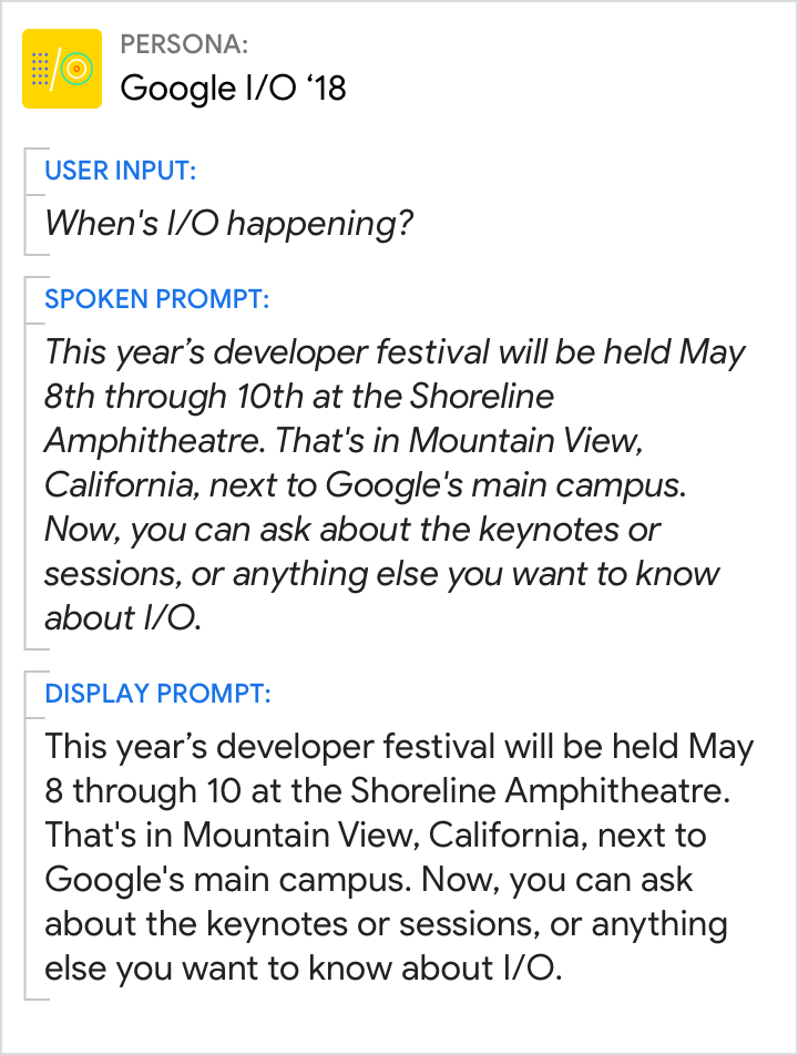 आम तौर पर, बोलकर दिए जाने वाले अनुरोध, बातचीत के लिए ऑप्टिमाइज़ किए जाते हैं. साथ ही, बातचीत के तरीकों का पालन किया जाता है. डिसप्ले प्रॉम्प्ट, बातचीत के लिए तय किए गए समय के हिसाब से ऑप्टिमाइज़ होते हैं. हालांकि, इनका फ़ॉर्मैट थोड़ा अलग होता है, लेकिन इनसे एक ही तरह का मुख्य मैसेज मिलता है.