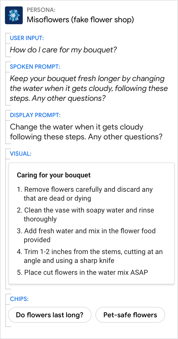 Konversationskomponenten (Aufforderungen und Chips) sollten für jeden Dialogwechsel entwickelt werden.
