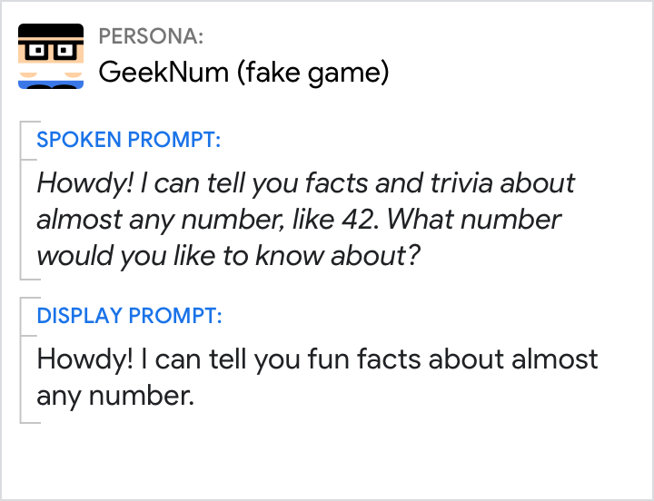 कान और आंख, दोनों के लिए डिज़ाइन बनाएं. सीधे तौर पर, लोगों से बातचीत शुरू करना सबसे आसान है. इसके लिए, पहले से बनी हुई किसी बातचीत को ध्यान में रखें. इसके बाद, इसे छोटा करके डिसप्ले प्रॉम्प्ट बनाएं.