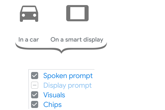 Para conversas no carro ou em um smart display, a tela nem sempre estará disponível para o usuário. Portanto, os prompts de voz precisam transmitir a maior parte da conversa e transmitir a mensagem principal. A tela pode ser usada para informações visuais complementares e sugestões para continuar ou dinamizar a conversa.