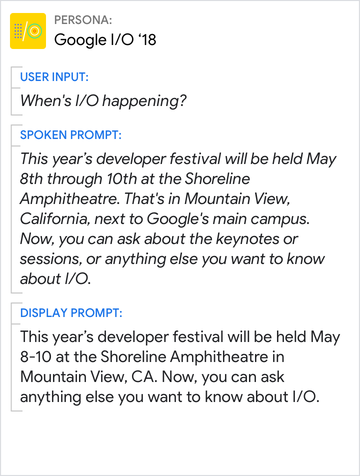 | Gesprochene Aufforderung | Der Inhalt, den deine Aktion über TTS oder vorab aufgezeichnete Audioinhalte mit dem Nutzer spricht |