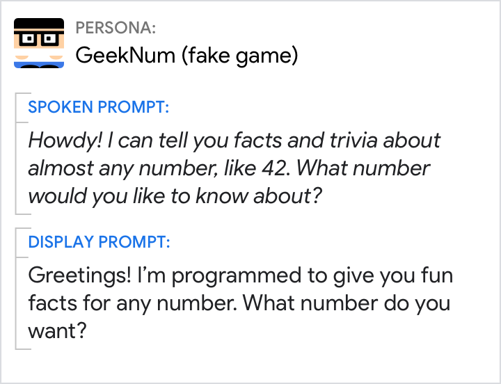 कान और आंख, दोनों के लिए डिज़ाइन बनाएं. सीधे तौर पर, लोगों से बातचीत शुरू करना सबसे आसान है. इसके लिए, पहले से बनी हुई किसी बातचीत को ध्यान में रखें. इसके बाद, इसे छोटा करके डिसप्ले प्रॉम्प्ट बनाएं.
