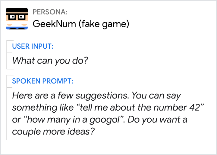 這項功能適用於智慧音箱、耳罩式耳機、智慧螢幕或車內音響上的對話。因此,雖然部分裝置設有螢幕,也無法保證使用者會看著畫面,或是與方塊互動不足夠,因此建議內容必須依照語音提示出現。