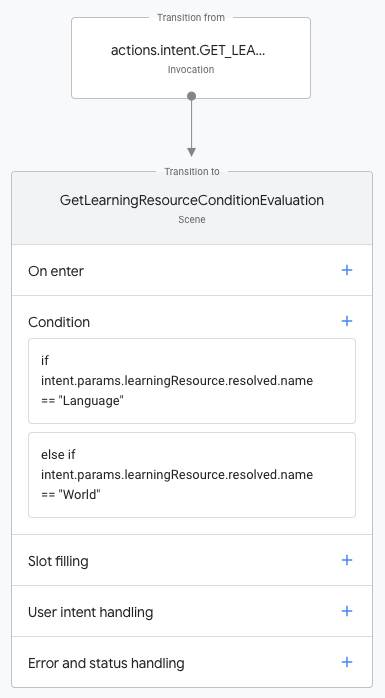7. On the built-in intent page, click Add condition evaluation scene. This action automatically creates a scene with conditions for the selected learning resources.
