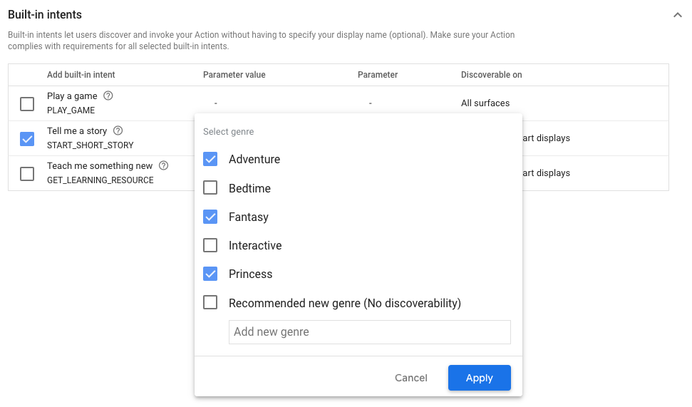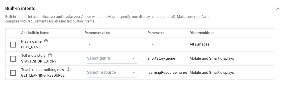 • Built-in intents may include invocation parameters, like genres for storytelling or topics for education, providing users with more specific ways to discover and interact with your Action based on their interests.