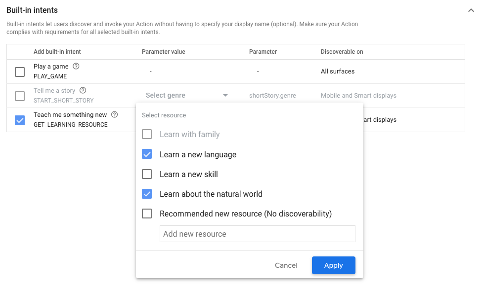 4. Under Parameter value, choose one or more resources for your educational experience. These values allow users to implicitly invoke your Action using a resource topic. For example, "Ok Google, teach me a new language".