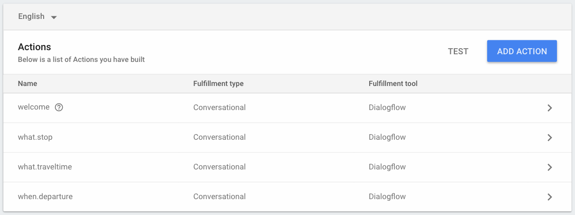 Dialogflow'da Actions'ınız ve bunların çağrı ifadeleri, örtülü çağrı için belirttiğiniz amaçlarda yer alan eğitim ifadeleri olarak tanımlanır. Dialogflow entegrasyon kılavuzunda açıklandığı gibi Dialogflow Console'da tek adımlı bir işlem kullanarak İşleminize derin bağlantılar ve örtülü çağrılar için destek ekleyebilirsiniz.