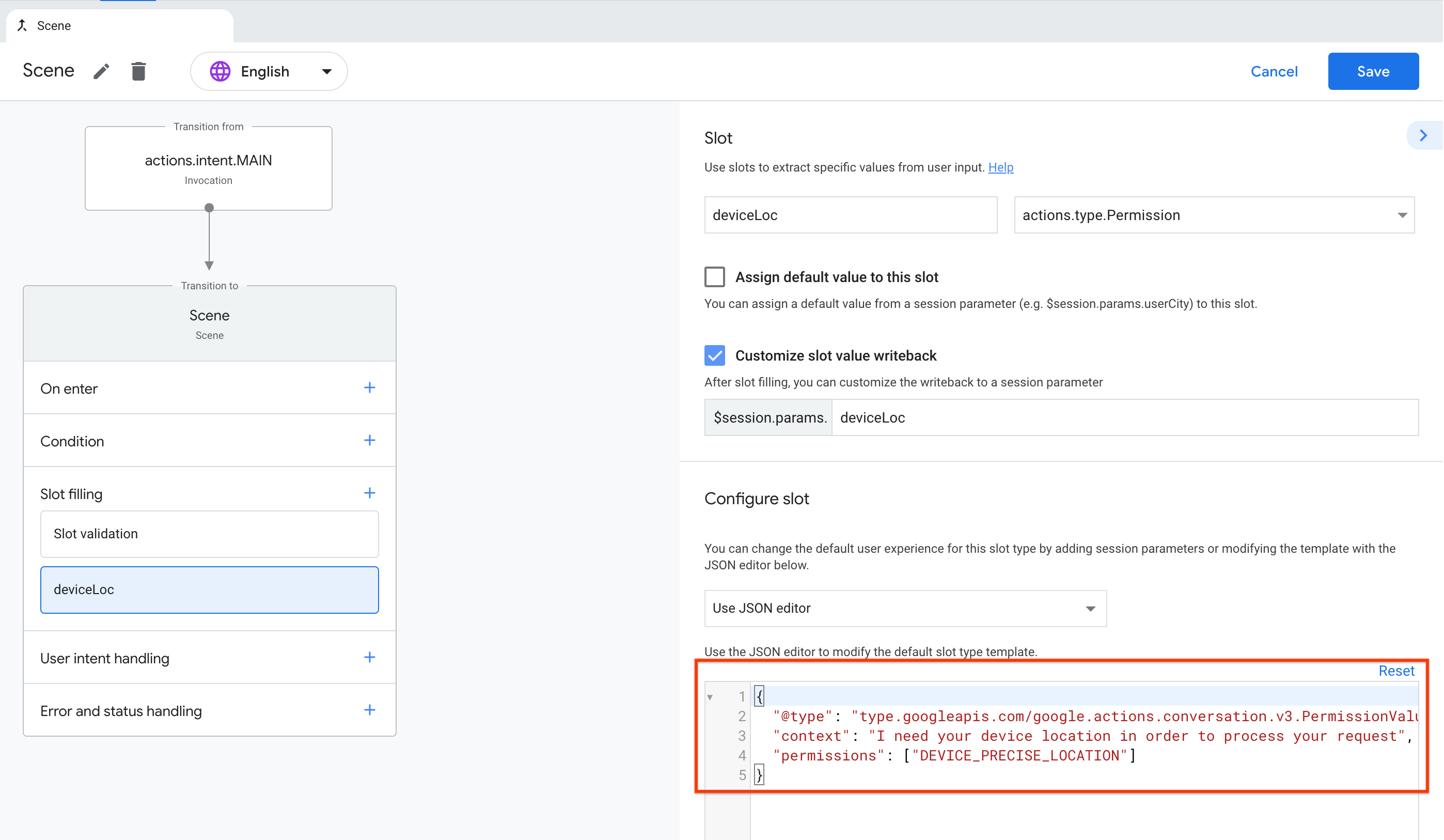 Anda kini dapat menyediakan string konteks dan daftar izin yang akan diberikan melakukan konfigurasi slot. String konteks adalah alasan mengapa Anda meminta informasi dari pengguna, dan ditampilkan kepada pengguna ketika mereka diminta untuk memberikan izin ke Action Anda.