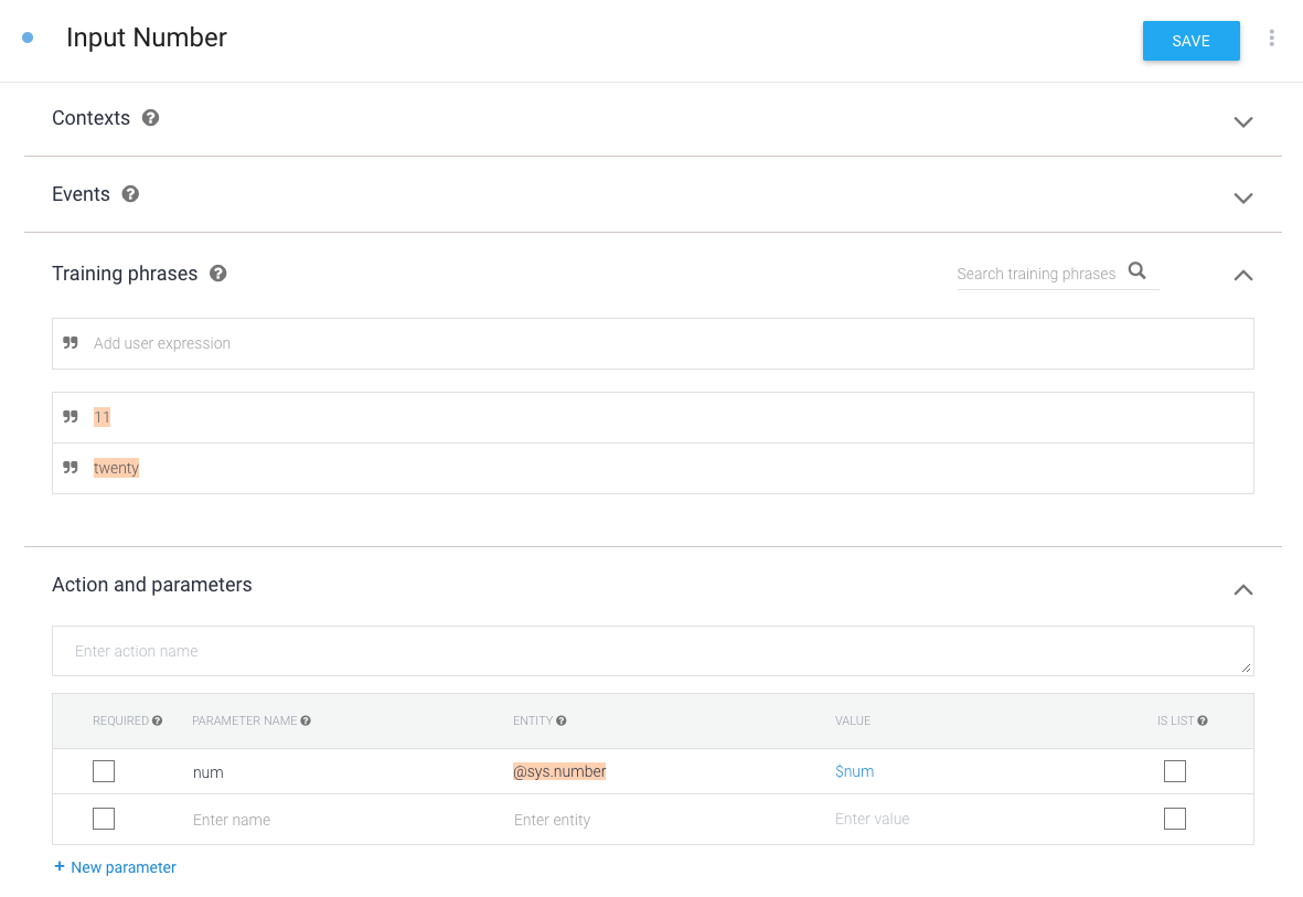 शुरू करने का इंटेंट (input.welcome) और एक ऐसा डायलॉग इंटेंट (input.number) जो