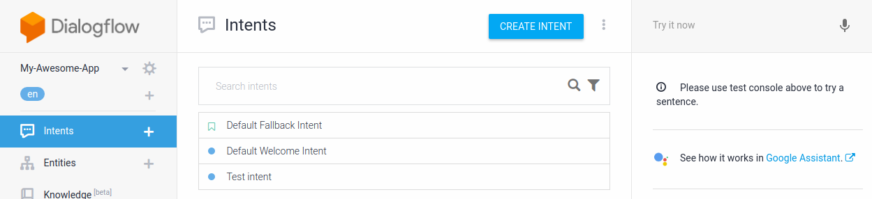 Bây giờ, bạn sẽ thấy bảng điều khiển Dialogflow và bảng trình đơn ở bên trái. Nếu bạn đang sử dụng một màn hình nhỏ và trình đơn bị ẩn, hãy nhấp vào ở góc trên bên trái.