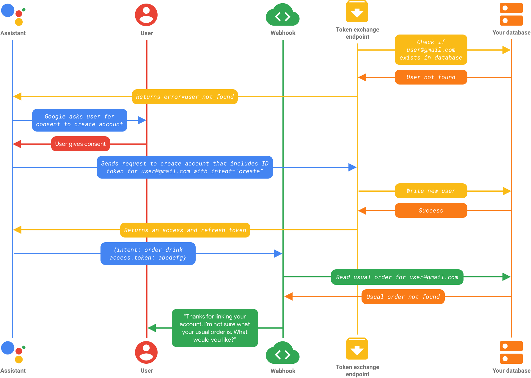 Trong trường hợp này, người dùng mà user@gmail.com đại diện sẽ tồn tại trong phần phụ trợ của bạn, để điểm cuối trao đổi mã thông báo sẽ trả về một mã thông báo cho người dùng. trong Hành động của bạn hiện được liên kết với Tài khoản Google của họ. yêu cầu ban đầu (“Đặt hàng theo thông thường của tôi”) khớp với đối tượng có ý định tuỳ chỉnh order_drink. Sau đó, webhook của bạn sẽ xử lý việc thực hiện ý định được so khớp và truy vấn cơ sở dữ liệu cho thứ tự thông thường của user@gmail.com. Sau đó, người dùng có thể tiếp tục cuộc trò chuyện với Trợ lý.