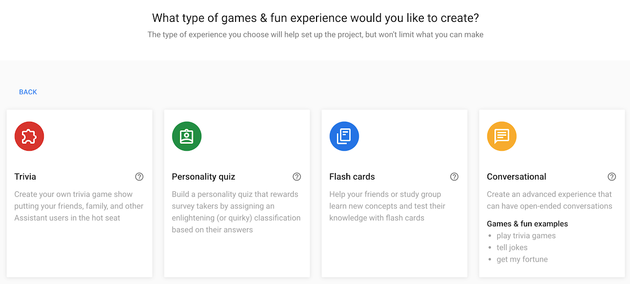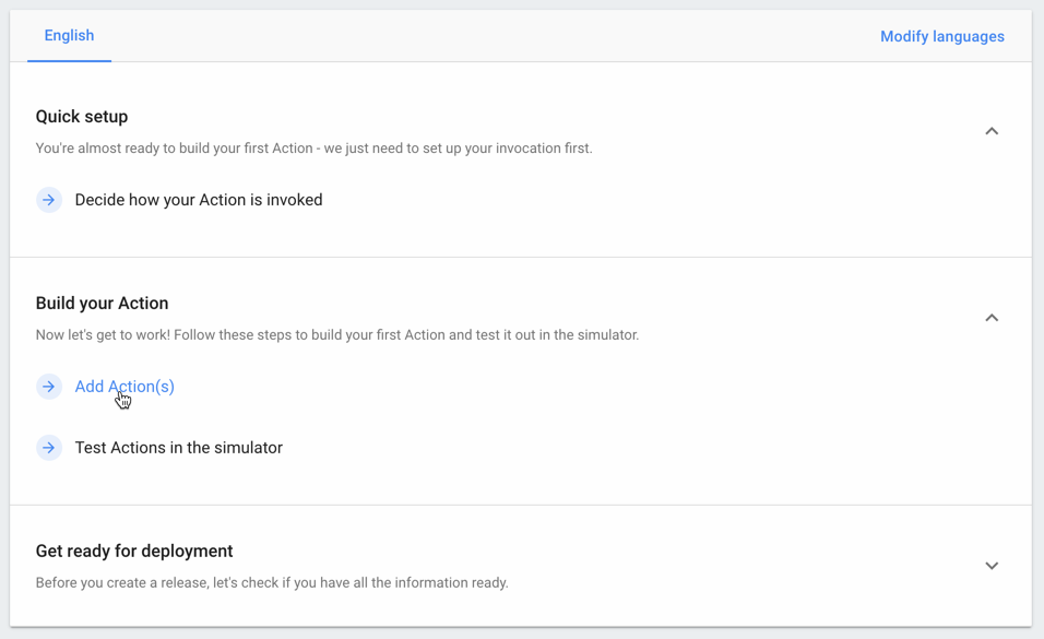 इस पेज पर, आपका Actions प्रोजेक्ट बनाया जाता है और Dialogflow एजेंट को कॉन्फ़िगर किया जाता है.