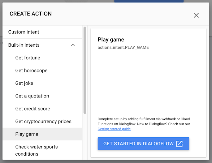 बिल्ट-इन इंटेंट में जाकर, गेम खेलें चुनें और Dialogflow में शुरू करें पर क्लिक करें.