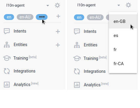O Dialogflow permite especificar suporte de vários idiomas no agente, o que permite