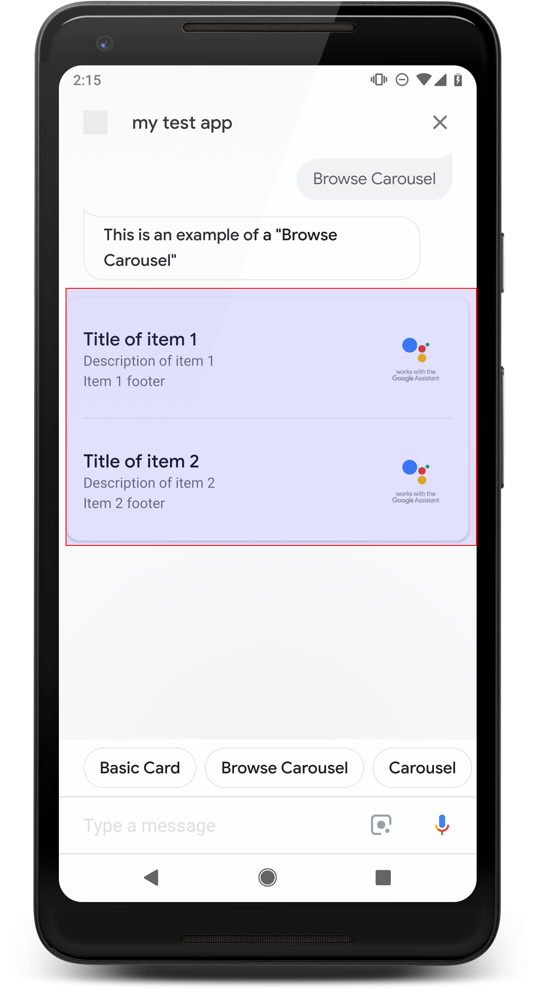 app.intent('Basic Card', (conv) => { if (!conv.screen) { conv.ask('Sorry, try this on a screen device or select the ' + 'phone surface in the simulator.'); conv.ask('Which response would you like to see next?'); return; } conv.ask(`Here's an example of a basic card.`); conv.ask(new BasicCard({ text: `This is a basic card. Text in a basic card can include "quotes" and most other unicode characters including emojis. Basic cards also support some markdown formatting like *emphasis* or _italics_, **strong** or __bold__, and ***bold itallic*** or ___strong emphasis___ as well as other things like line \nbreaks`, // Note the two spaces before '\n' required for // a line break to be rendered in the card. subtitle: 'This is a subtitle', title: 'Title: this is a title', buttons: new Button({ title: 'This is a button', url: 'https://assistant.google.com/', }), image: new Image({ url: 'https://storage.googleapis.com/actionsresources/logo_assistant_2x_64dp.png', alt: 'Image alternate text', }), display: 'CROPPED', })); conv.ask('Which response would you like to see next?'); });