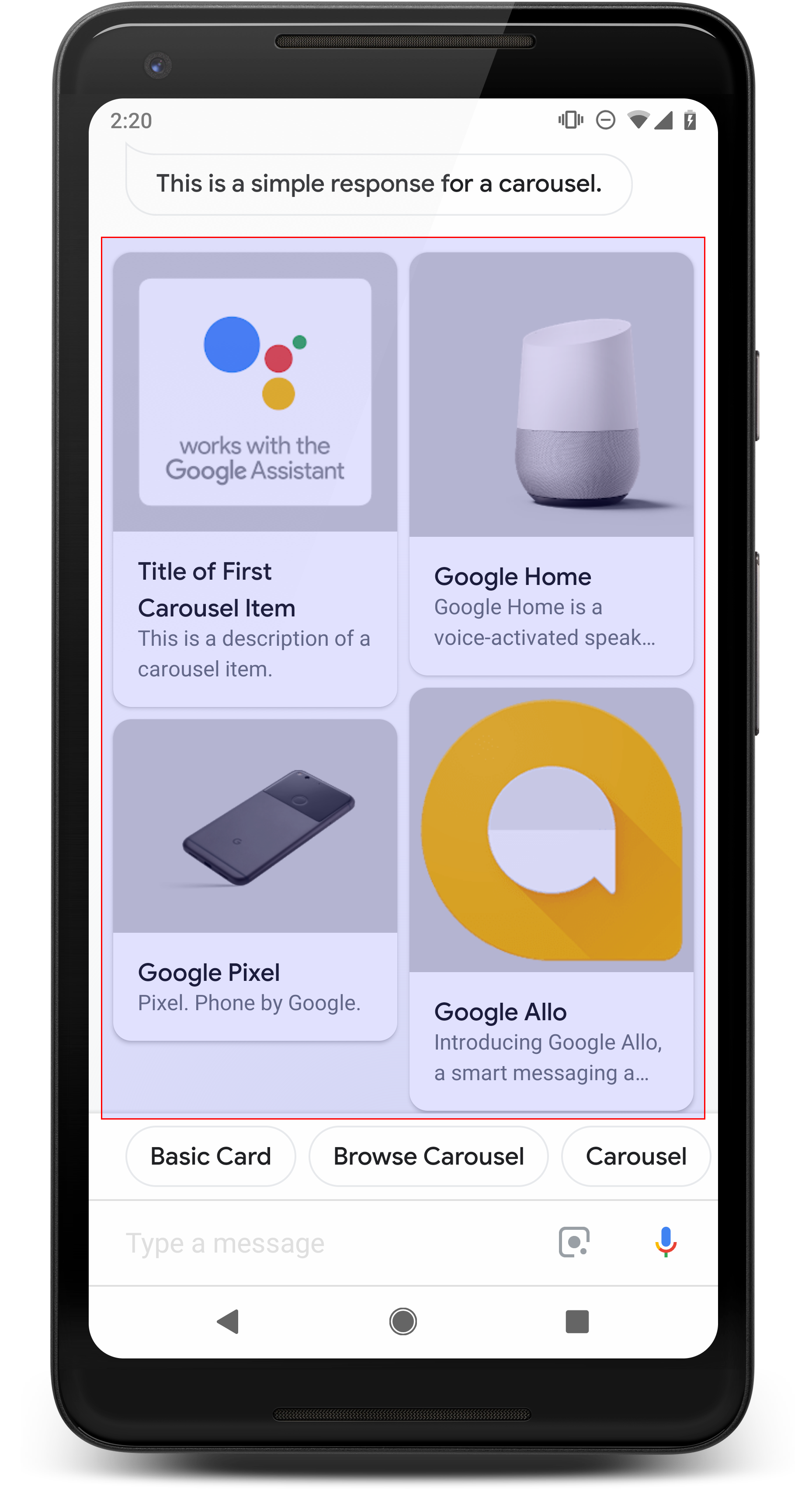 app.intent('Carousel', (conv) => { if (!conv.screen) { conv.ask('Sorry, try this on a screen device or select the ' + 'phone surface in the simulator.'); return; } conv.ask('This is a carousel example.'); // Create a carousel conv.ask(new Carousel({ title: 'Carousel Title', items: { // Add the first item to the carousel 'SELECTION_KEY_ONE': { synonyms: [ 'synonym 1', 'synonym 2', 'synonym 3', ], title: 'Title of First Carousel Item', description: 'This is a description of a carousel item.', image: new Image({ url: 'https://storage.googleapis.com/actionsresources/logo_assistant_2x_64dp.png', alt: 'Image alternate text', }), }, // Add the second item to the carousel 'SELECTION_KEY_GOOGLE_HOME': { synonyms: [ 'Google Home Assistant', 'Assistant on the Google Home', ], title: 'Google Home', description: 'Google Home is a voice-activated speaker powered by ' + 'the Google Assistant.', image: new Image({ url: 'https://storage.googleapis.com/actionsresources/logo_assistant_2x_64dp.png', alt: 'Google Home', }), }, // Add the third item to the carousel 'SELECTION_KEY_GOOGLE_PIXEL': { synonyms: [ 'Google Pixel XL', 'Pixel', 'Pixel XL', ], title: 'Google Pixel', description: 'Pixel. Phone by Google.', image: new Image({ url: 'https://storage.googleapis.com/actionsresources/logo_assistant_2x_64dp.png', alt: 'Google Pixel', }), }, }, })); });