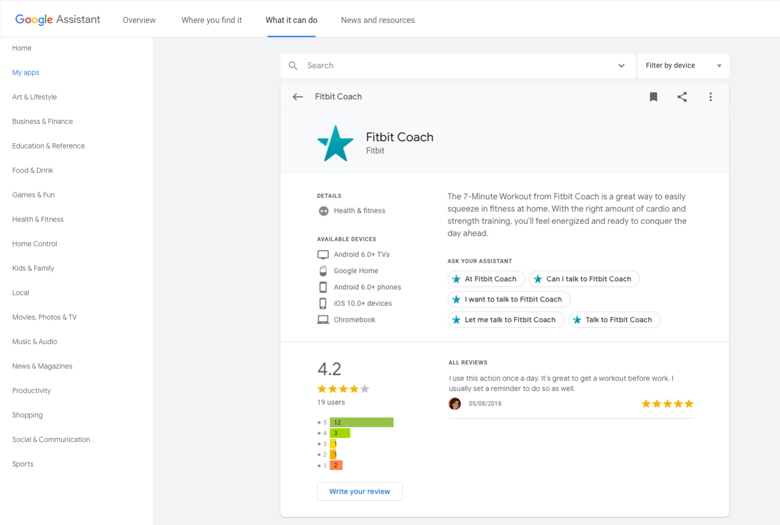 Các ví dụ sau đây minh hoạ một trang cho Fitbit Coach, một Hành động về sức khoẻ và thể hình hướng dẫn người dùng thực hiện bài tập thể dục tại nhà: