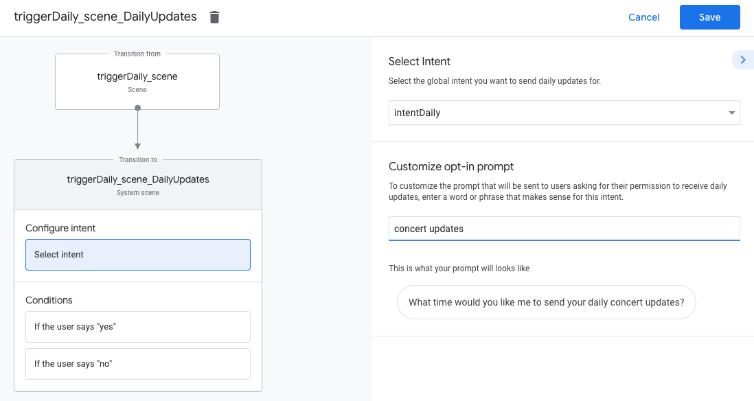 3. उपयोगकर्ता दिन का वह समय शेड्यूल करता है जब वह आपके हर दिन के अपडेट पाना चाहता है. साथ ही, आपके अपडेट को Google Assistant के साथ रजिस्टर करता है.