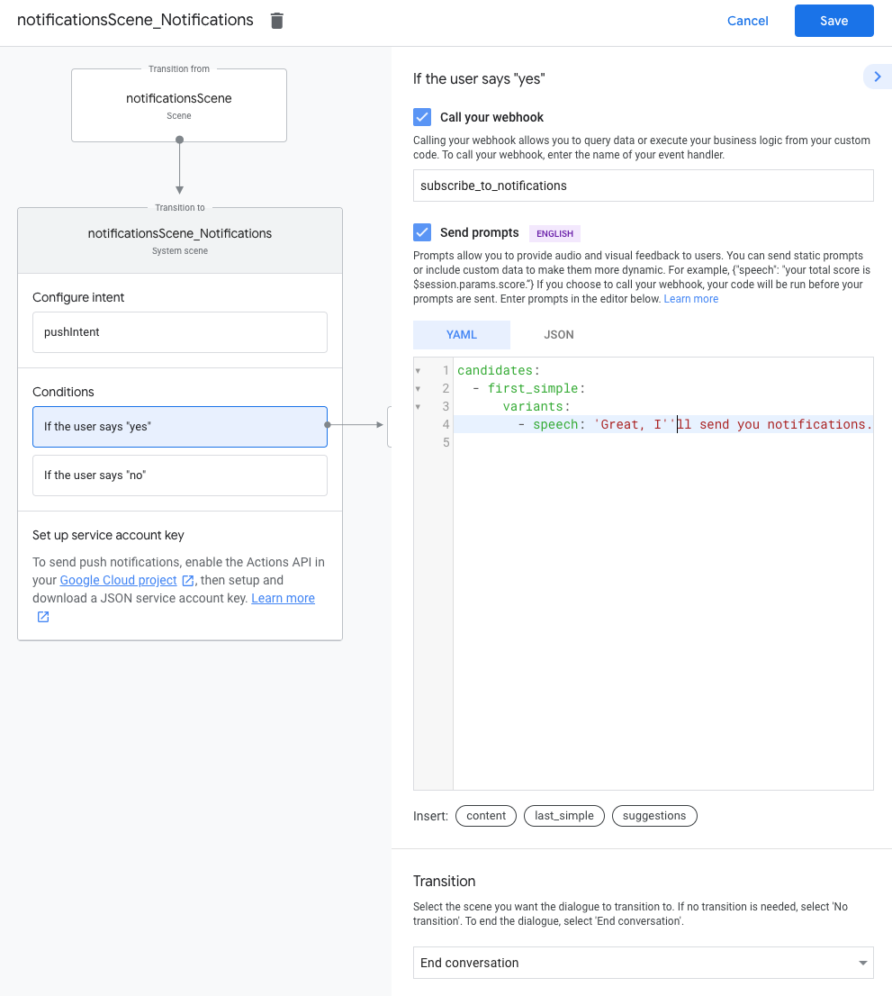 Push-Benachrichtigungen werden über die Actions API an Nutzer gesendet. Wenn Sie diese API verwenden möchten, müssen Sie sie in Ihrem Google Cloud-Projekt aktivieren und einen JSON-Dienstkontoschlüssel einrichten und herunterladen.